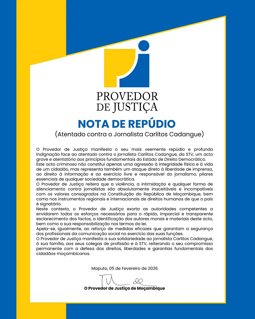 Condenar é necessário; agir é obrigatório. À luz da nota pública do Provedor de Justiça de Moçambique, que manifesta veemente repúdio e profunda indignação face à tentativa de assassinato do jornalista Carlitos Cadangue, torna-se evidente que o Estado reconhece a gravidade do acto, contudo, reconhecer não resolve, declarar não repara e, sobretudo, condenar não protege.