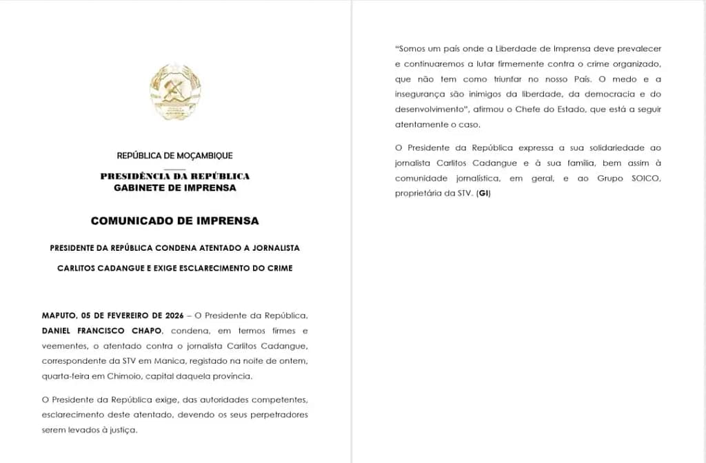 O atentado contra o jornalista Carlitos Cadangue, correspondente da STV na província de Manica, ocorrido na noite de quarta-feira, em Chimoio, recoloca no centro do debate público moçambicano a relação tensa entre liberdade de imprensa, segurança e responsabilidade do Estado. O comunicado oficial da Presidência da República, datado de 5 de fevereiro de 2026, ao mesmo tempo em que condena o crime, revela os limites estruturais da proteção efetiva ao exercício do jornalismo no país.